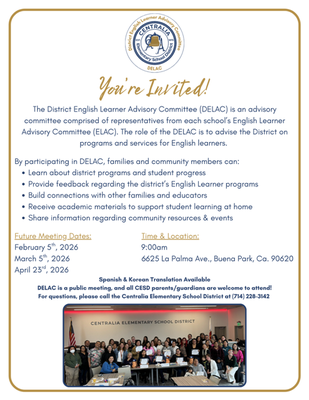 DELAC is an advisory committee comprised of representatives from each school’s English Learner Advisory Committee (ELAC). The role of the DELAC is to advise the District on programs and services for English Learners. It is a public meeting, and all CESD parents/guardians are welcome to attend.